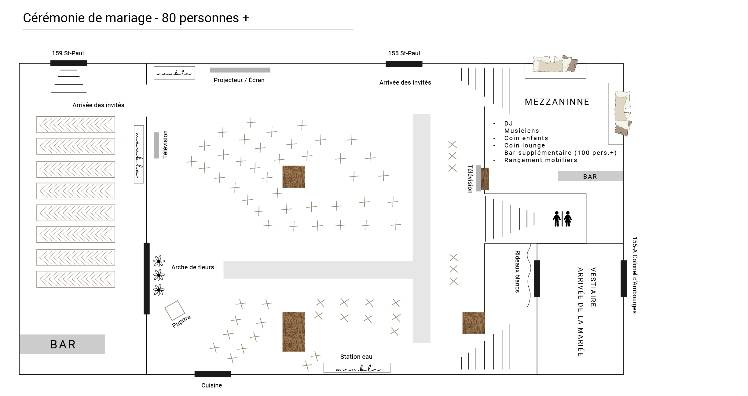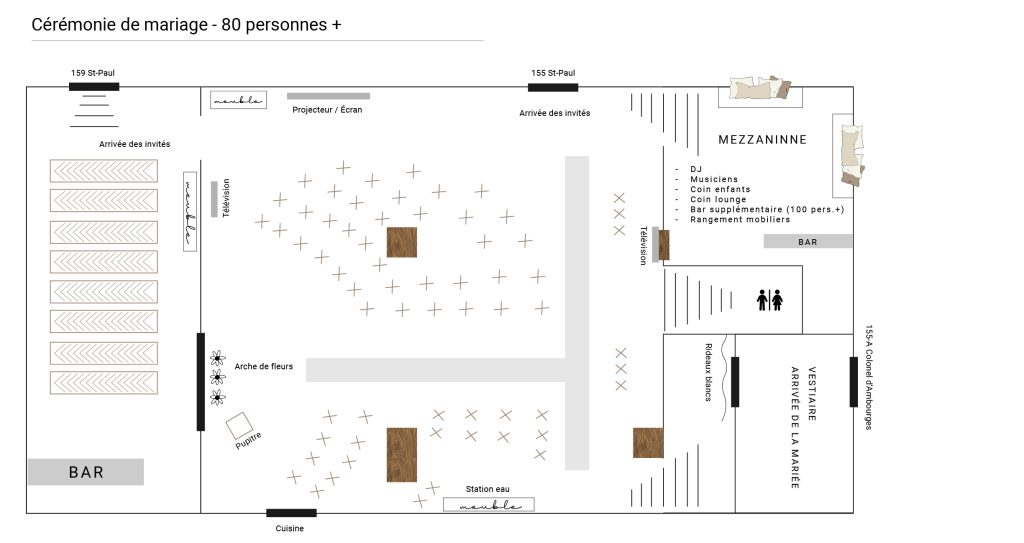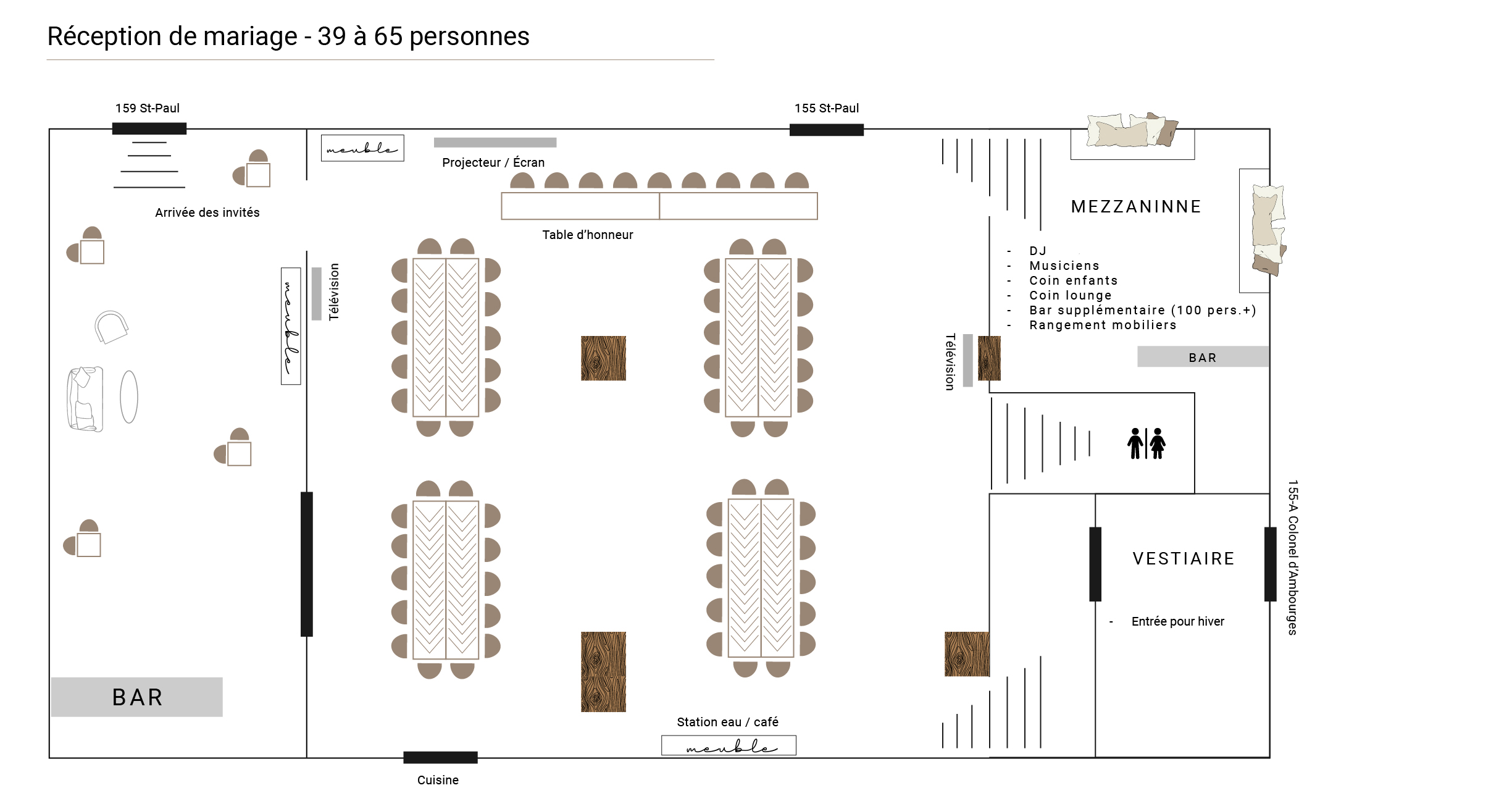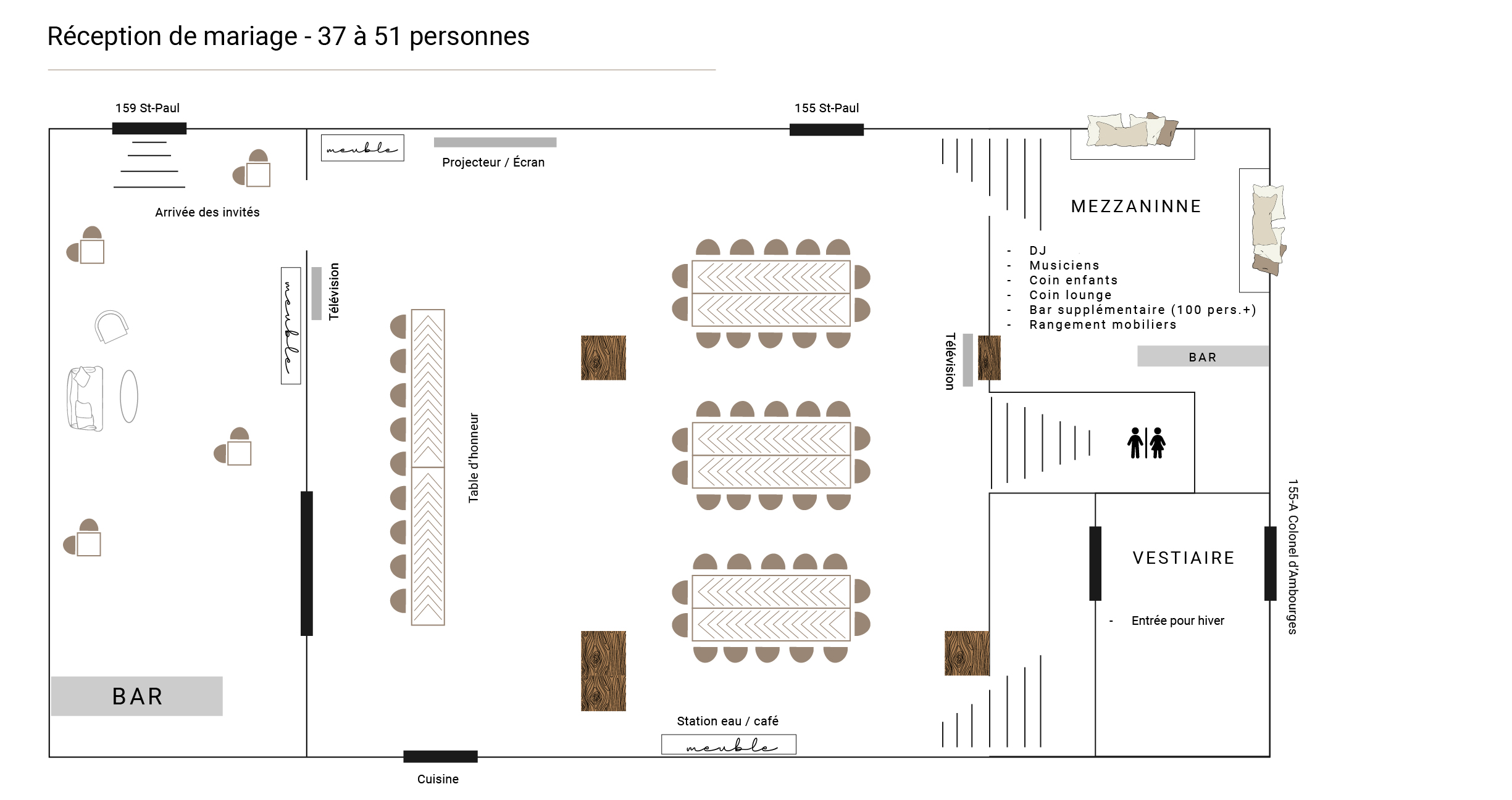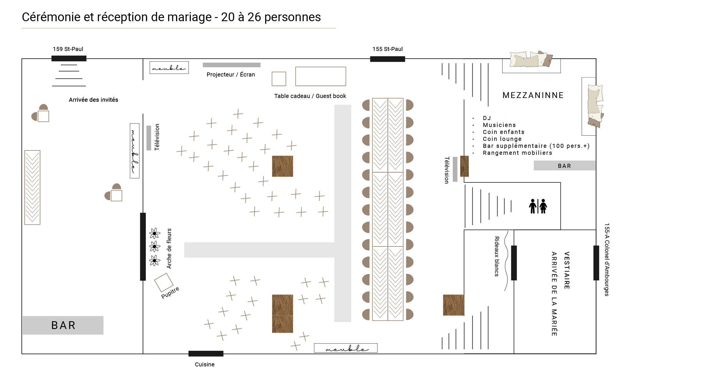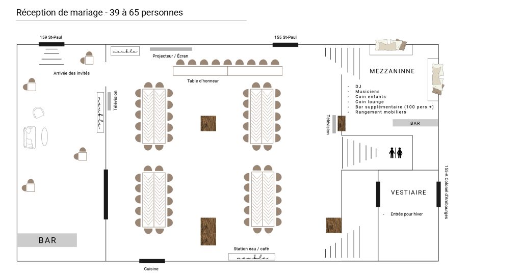 Vous pouvez réserver notre espace en tant que salle de réception pour mariage intime, pour un shower de bébé, un anniversaire, une conférence, une journée de team building, des funérailles et plus encore. – C’est un véritable joyau pour ceux qui recherchent une atmosphère intime et élégante pour leur mariage ou leur réception. Son design épuré et sophistiqué offre un canevas idéal pour personnaliser chaque détail de votre événement, que ce soit une cérémonie romantique ou une fête animée.