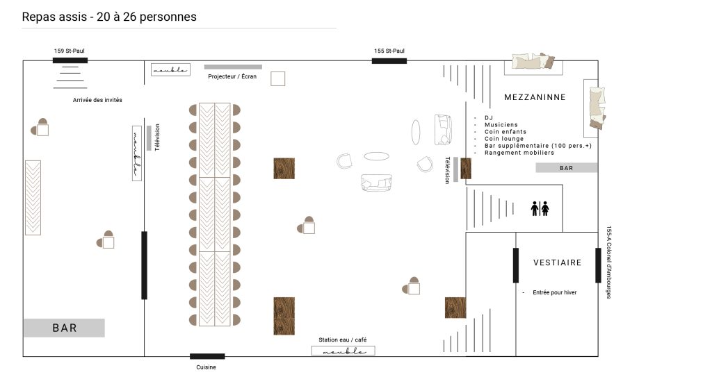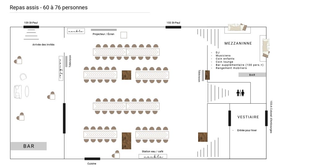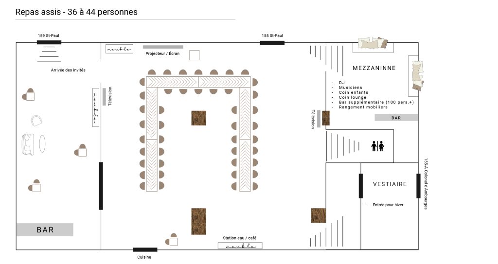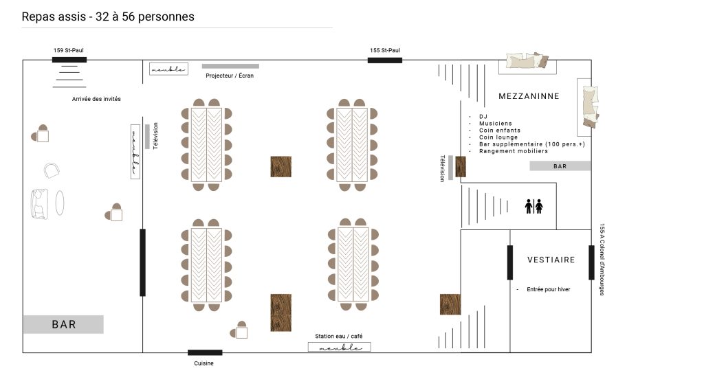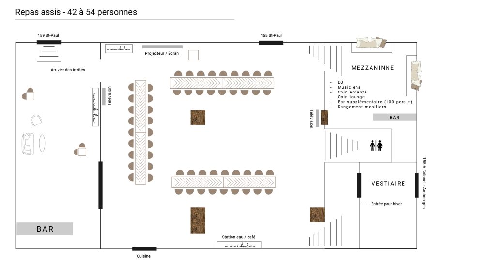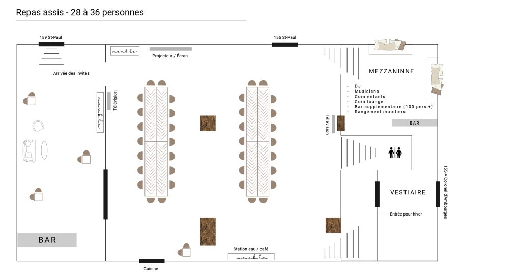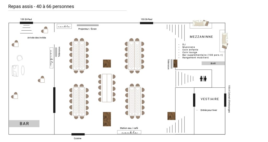 La location de notre salle d’événements Blanche est une formule clé en main qui permet d’éviter d’avoir à gérer une foule de fournisseurs et entreprises de location externe puisqu’elle inclut déjà tous les accessoires de service, le mobilier, le système de son, le matériel audio-visuel (projecteur, écran, micros), l’impression des menus, le service de sommellerie personnalisé (+$) ainsi que le service de raccompagnement.