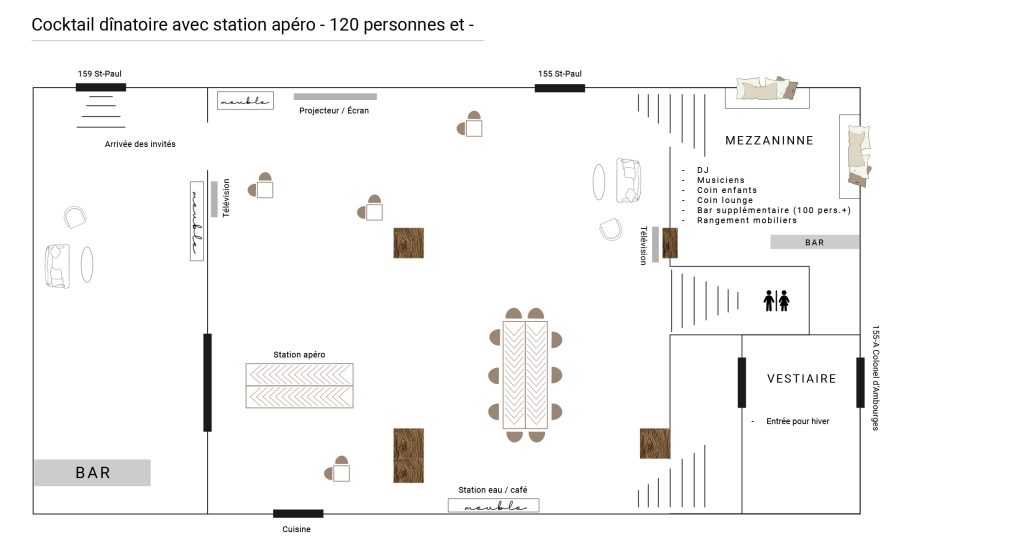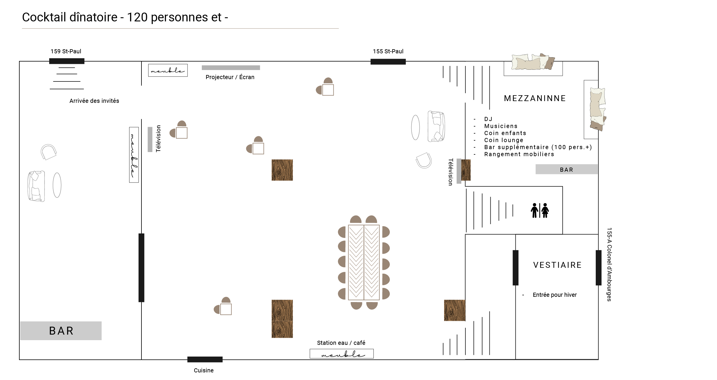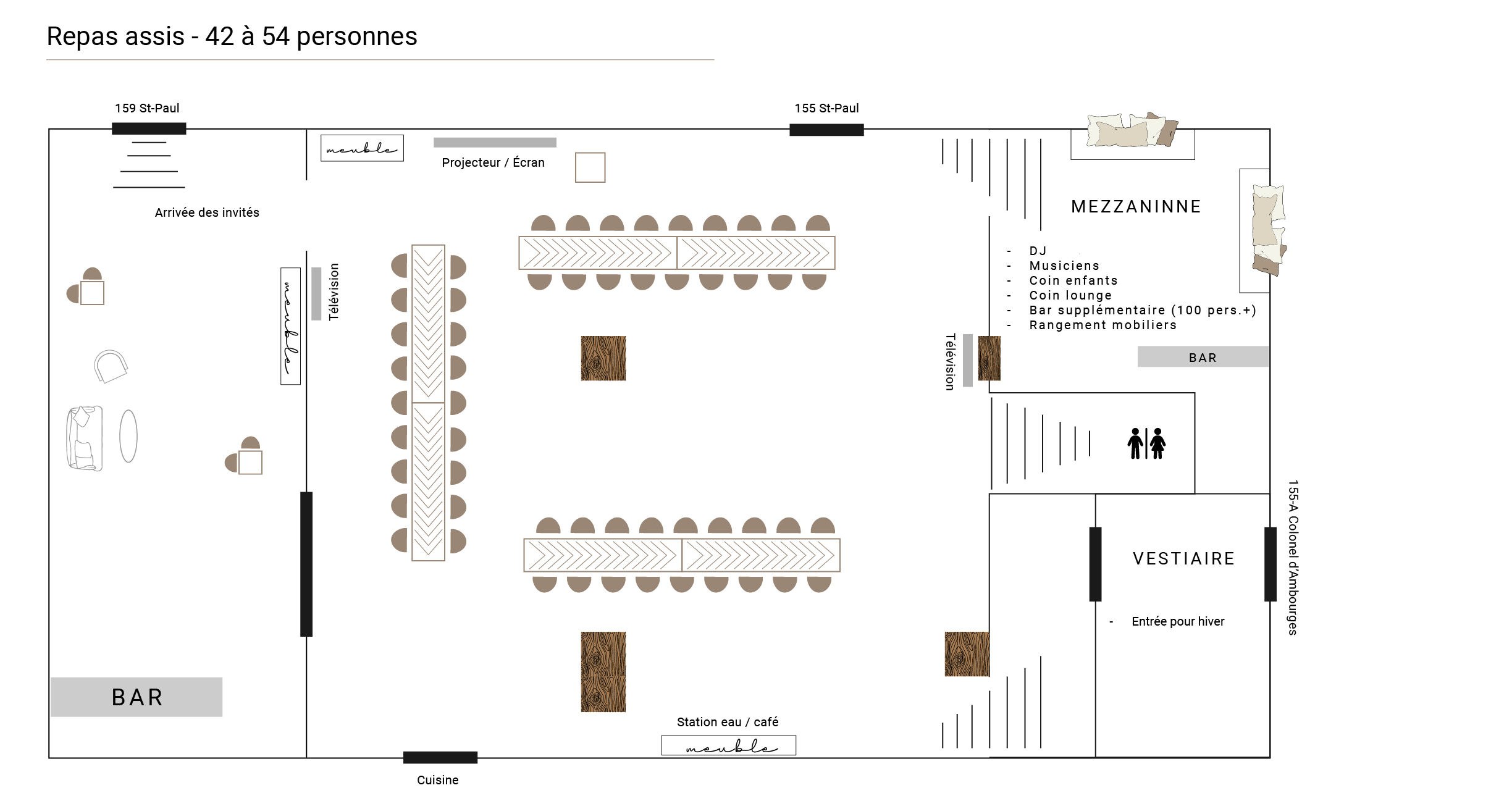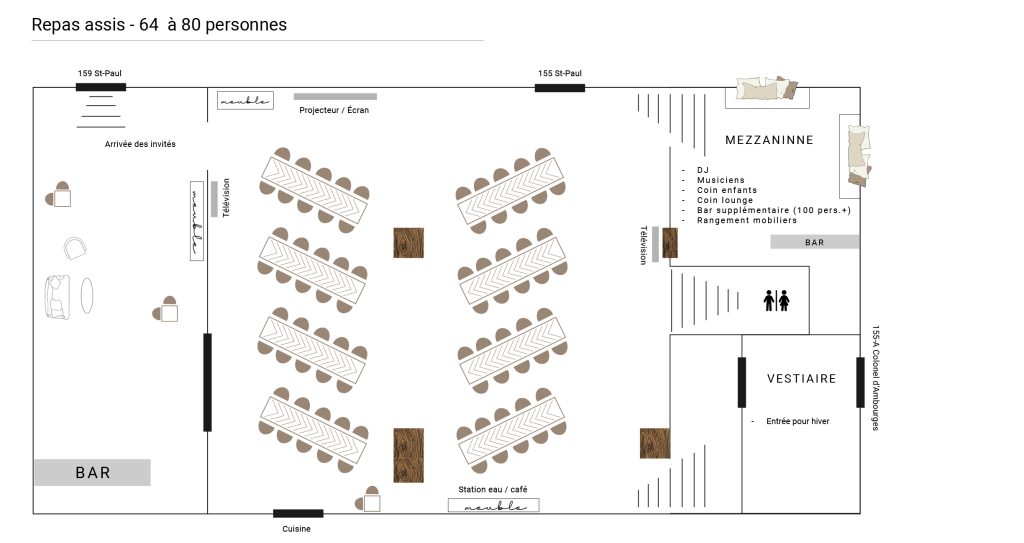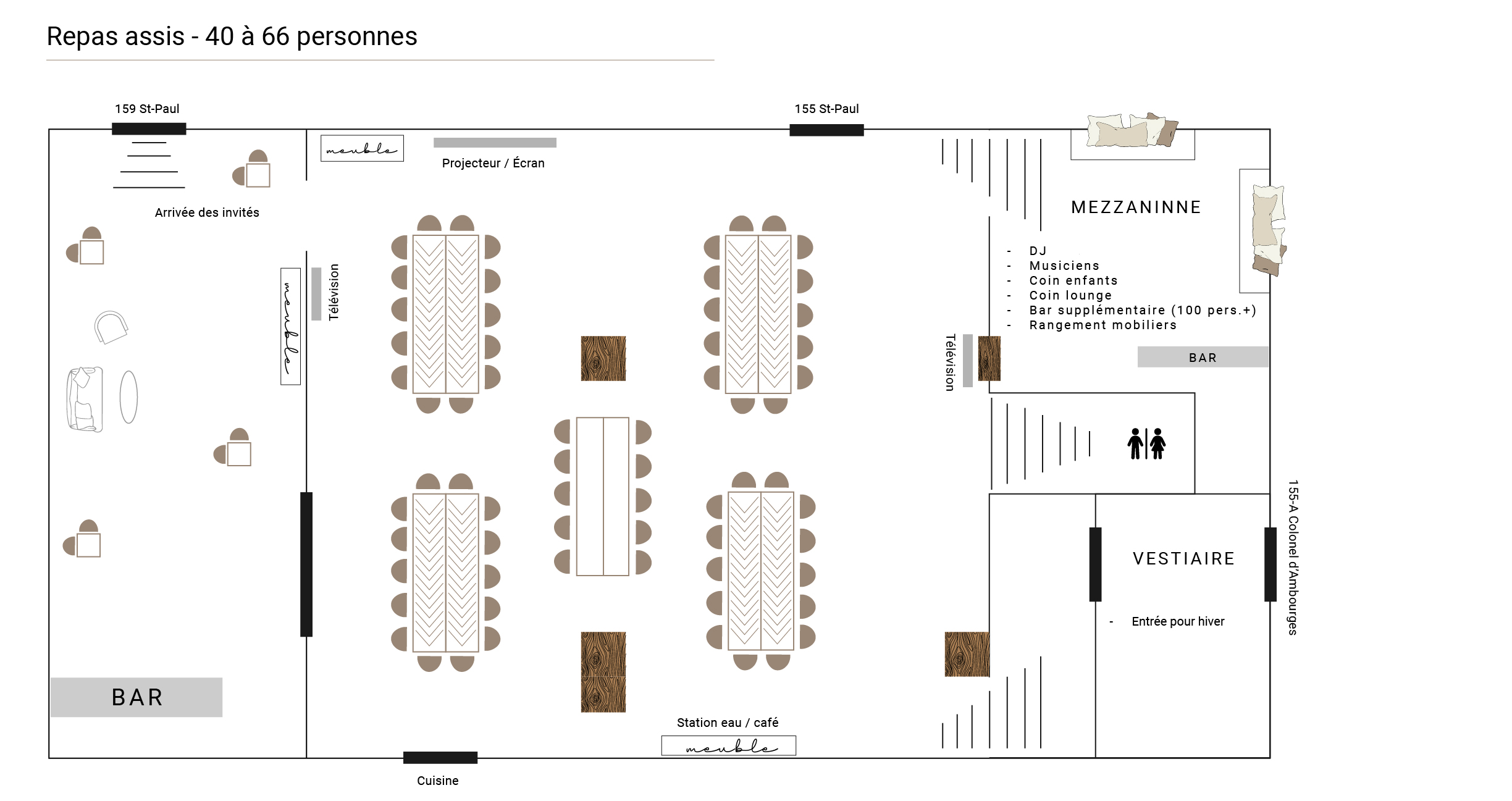 La location de notre salle d’événements Blanche est une formule clé en main qui permet d’éviter d’avoir à gérer une foule de fournisseurs et entreprises de location externe puisqu’elle inclut déjà tous les accessoires de service, le mobilier, le système de son, le matériel audio-visuel (projecteur, écran, micros), l’impression des menus, le service de sommellerie personnalisé (+$) ainsi que le service de raccompagnement.