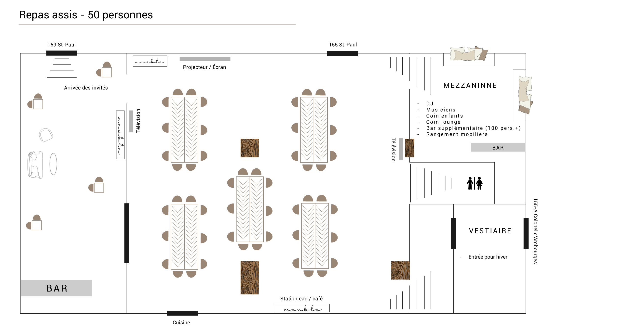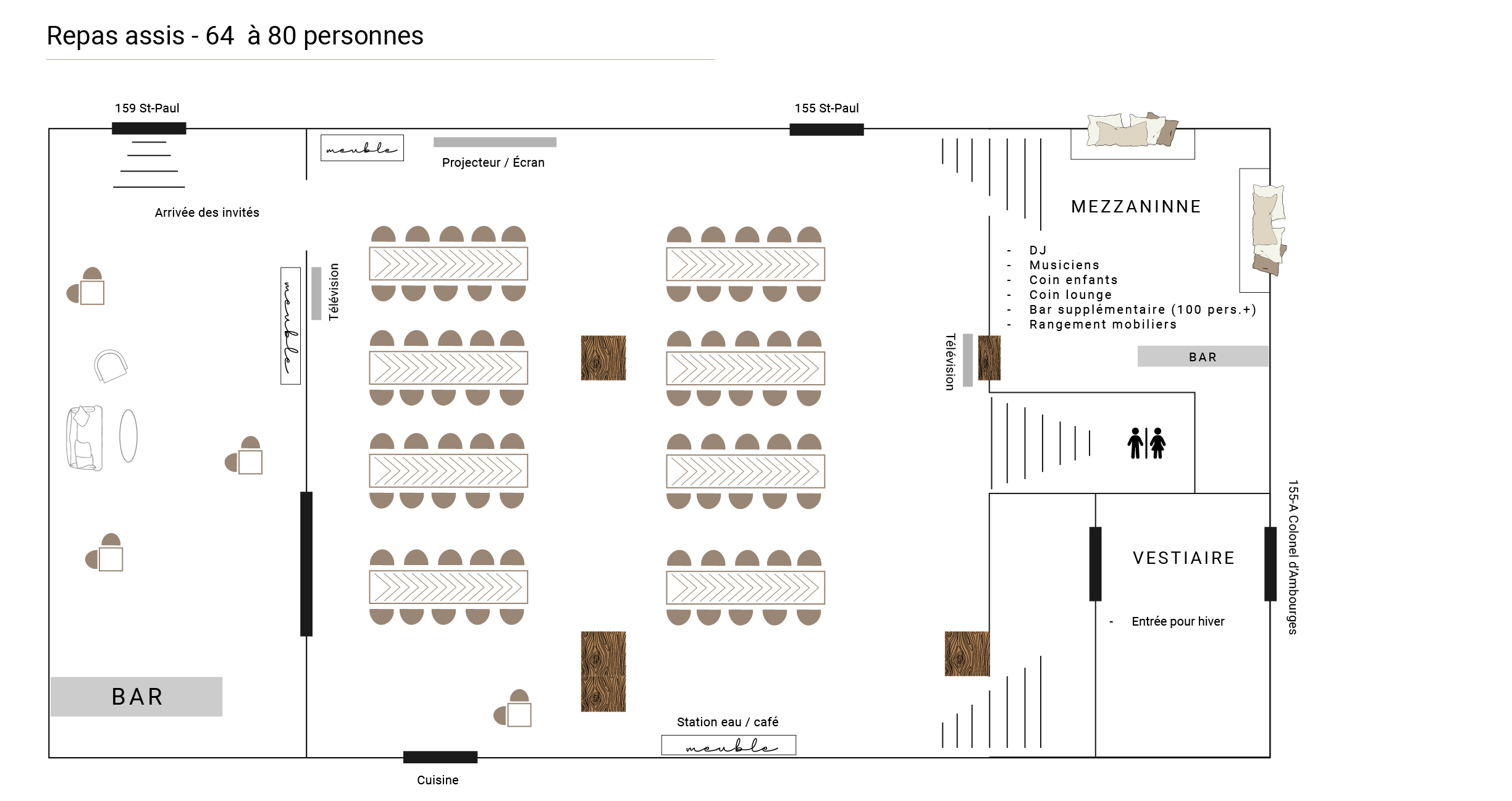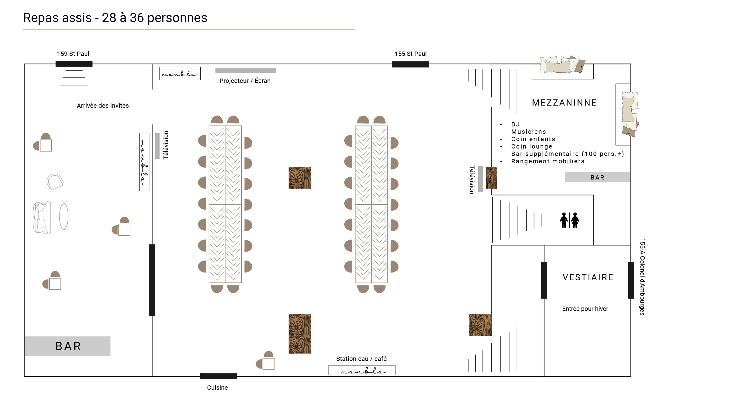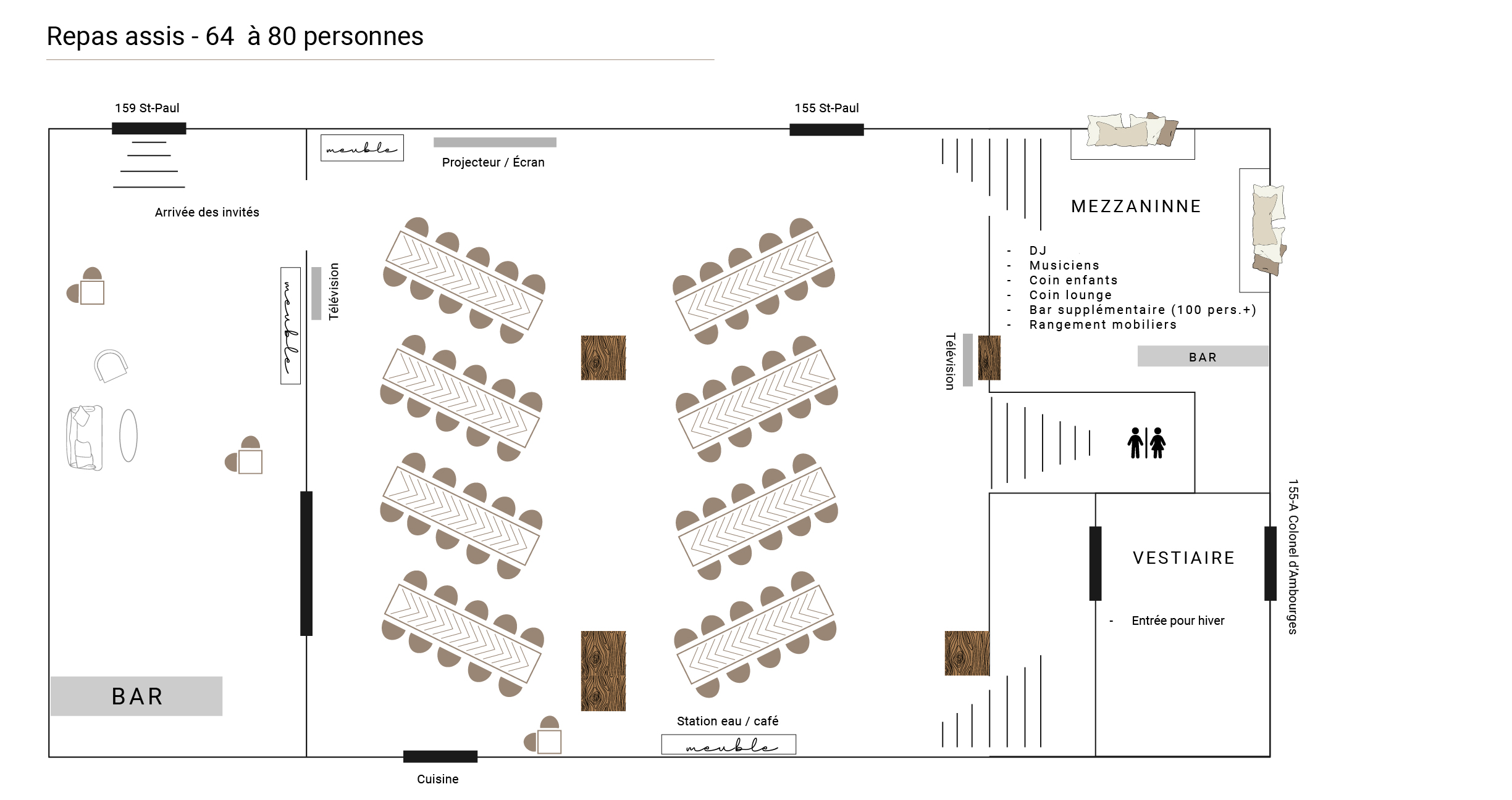 La location de notre salle d’événements Blanche est une formule clé en main qui permet d’éviter d’avoir à gérer une foule de fournisseurs et entreprises de location externe puisqu’elle inclut déjà tous les accessoires de service, le mobilier, le système de son, le matériel audio-visuel (projecteur, écran, micros), l’impression des menus, le service de sommellerie personnalisé (+$) ainsi que le service de raccompagnement.